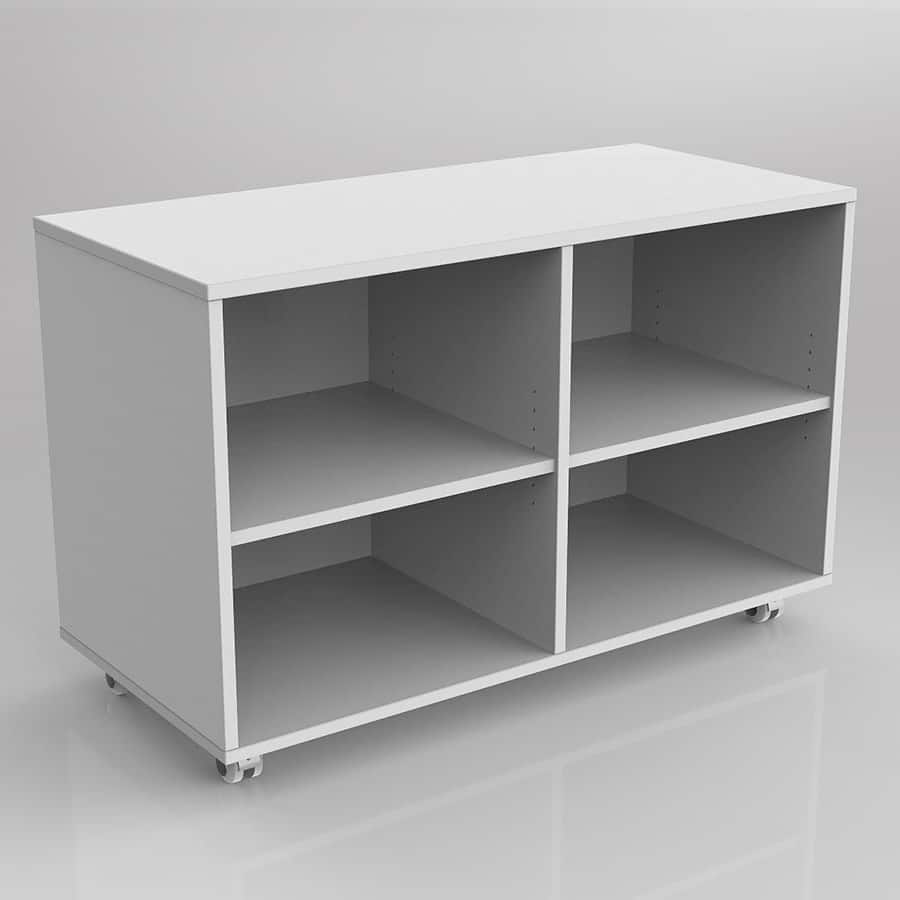 Network Caddy mobile bookcase unit 966mm wide x 640mm high x 460mm deep. 18mm top, shelves and base, 18mm studio white carcase, flush joined construction. Set on 5 x heavy duty castors. 2 x adjustable shelves.