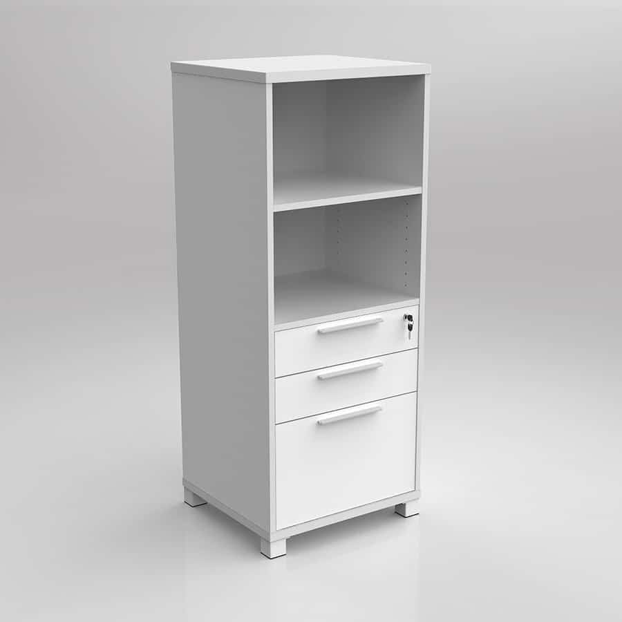 At 1250mm high the Network Vertical Tower Combo Storage unit with Drawers offers two open cavity spaces with one adjustable shelf. Below is a drawer unit with 2 small drawers and 1 filing drawer, all secured by a master key-locking system.