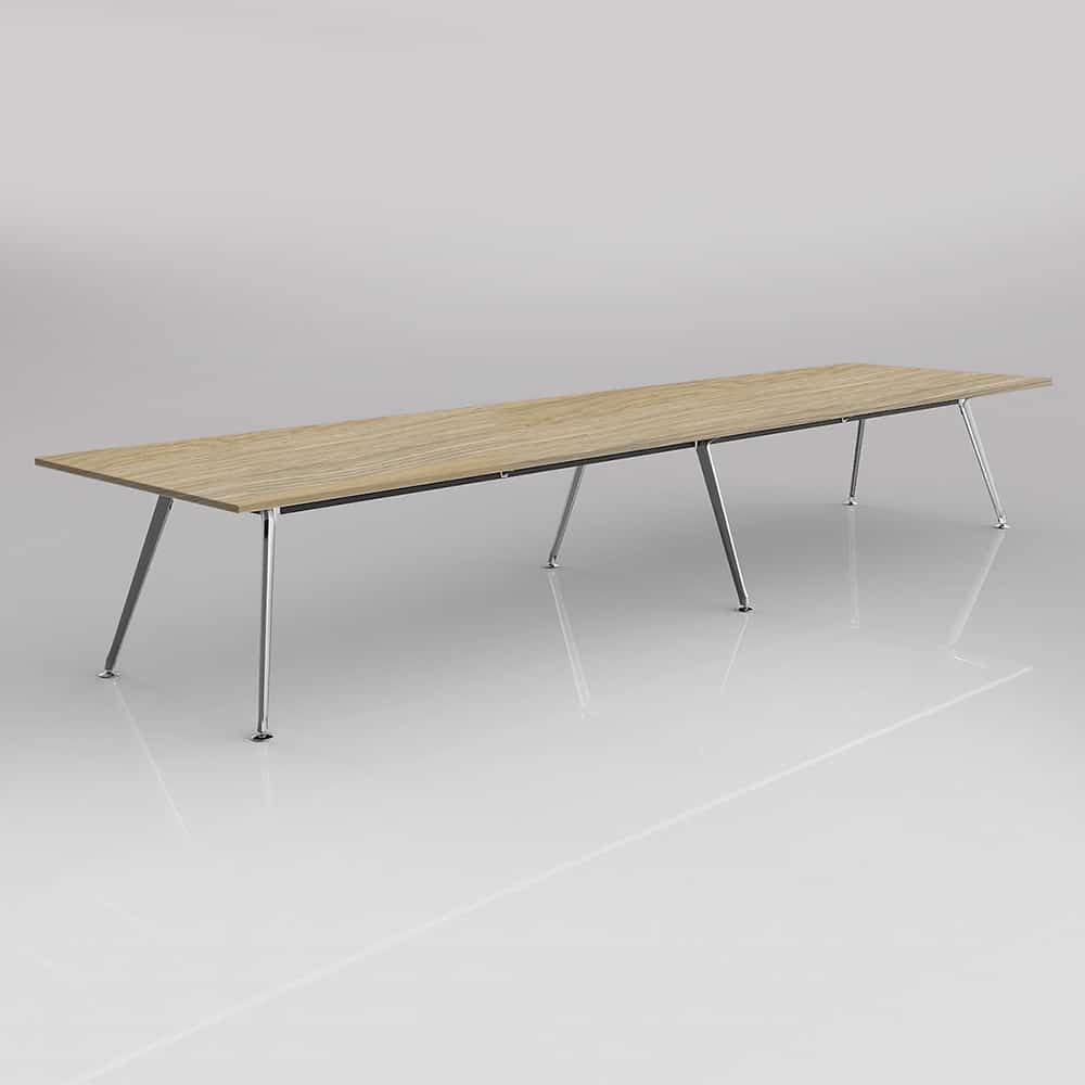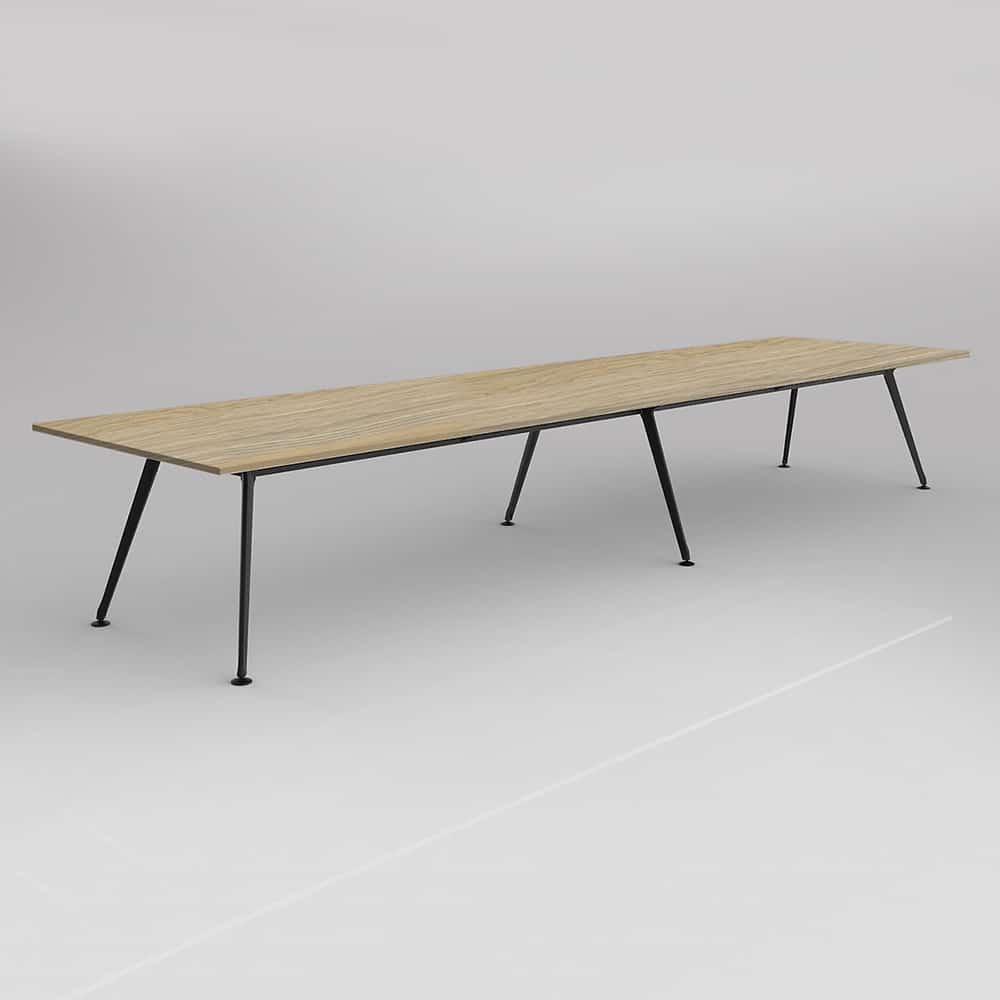 Team Meeting table complete with worksurface size of 3600mm x 1200mm or 4800mm x 1200mm. Black or white powdercoated or polished alloy 6 leg Double span construction with black top rail. 2 piece 25mm Studio white or new oak worktop with matching ABS Edge. Overall height 750mm with adjustable height glides.